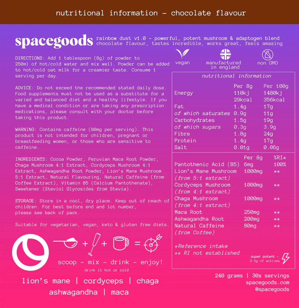 INGREDIENTS: Chocolate Ingredients: Cocoa Powder, Peruvian Maca Root Powder, Chaga Mushroom 4:1 Extract, Cordyceps Mushroom 4:1 Extract, Ashwagandha Root Powder, Lion’s Mane Mushroom 5:1 Extract, Natural Flavouring, Natural Caffeine (from Coffee Extract), Vitamin B5 (Calcium Pantothenate), Sweetener (Steviol Glycosides from Stevia).
