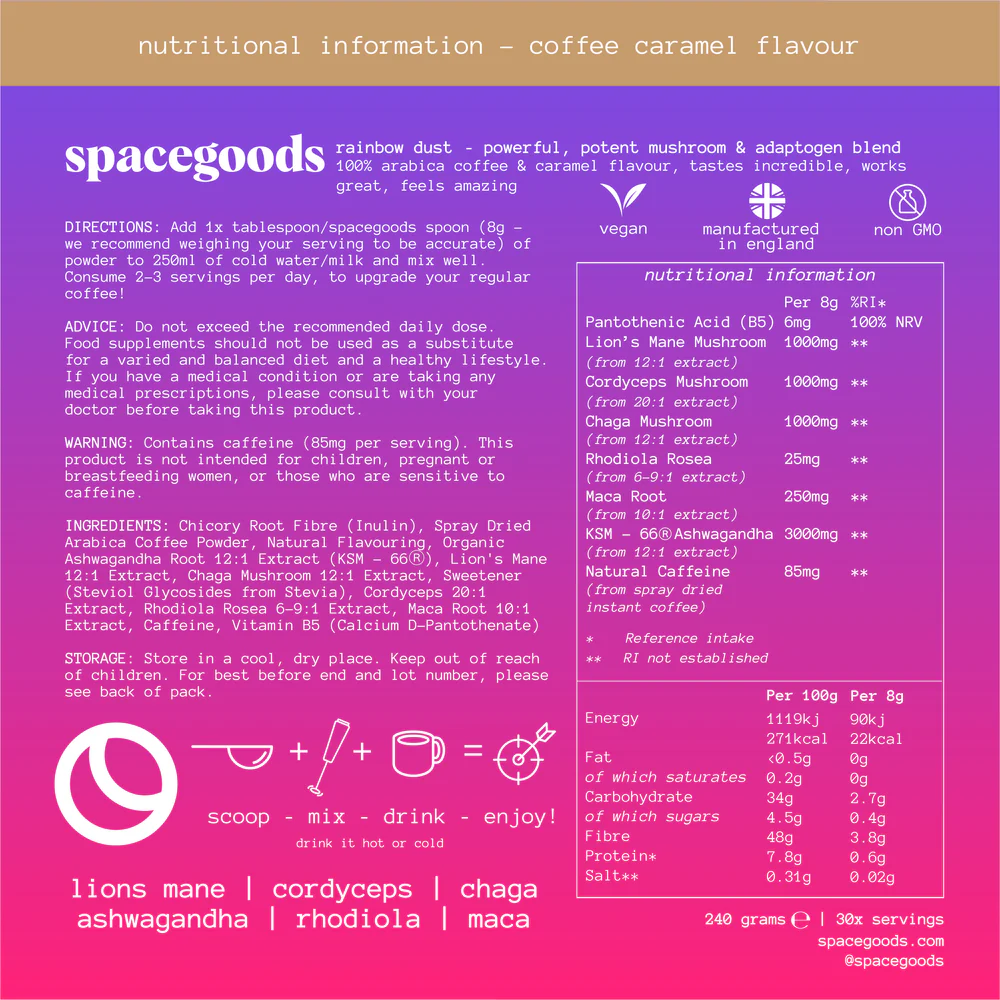 INGREDIENTS: Chicory Root Fibre (Inulin), Spray Dried Arabica Coffee Powder, Natural Flavouring, Organic Ashwagandha Root 12:1 Extract (KSM - 66®), Lion's Mane 12:1 Extract, Chaga Mushroom 12:1 Extract, Sweetener (Steviol Glycosides from Stevia), Cordyceps 20:1 Extract, Maca Root 10:1 Extract, Caffeine, Vitamin B5 (Calcium D-Pantothenate)