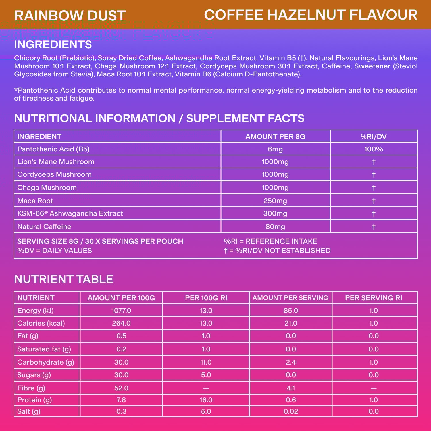 Rainbow Dust Coffee Hazelnut contains 21 kcal per 8g serving